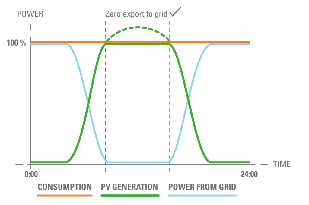Az EQUINOX2 sorozat minden hálózati invertere gyárilag tartalmaz nullás visszatáplálási rendszert, amelyhez nincs szükség további eszközre. Ez a funkció az adott telepítés igényei szerint ki- és bekapcsolható. A funkció lehetővé teszi a kimeneti teljesítmény folyamatos szabályozását, engedélyezve vagy tiltva a hálózati visszatáplálást külön berendezés megvásárlása nélkül.